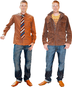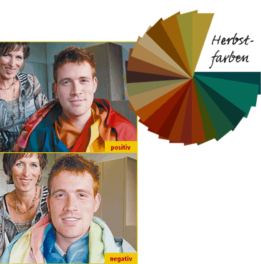 Bei einer Einkaufstour, begleitet von Brigitte Korn-Sonnenburg, werden die neuen Farberkennt- nisse in die Praxis umgesetzt. Tatsächlich findet Matthias ein gelbes T-Shirt, das zu seinem Typ passt und das er unter einer braunen Wildlederjacke trägt. Die schicke Variante: Hemd und Schlips in erdigen Herbstfarben.